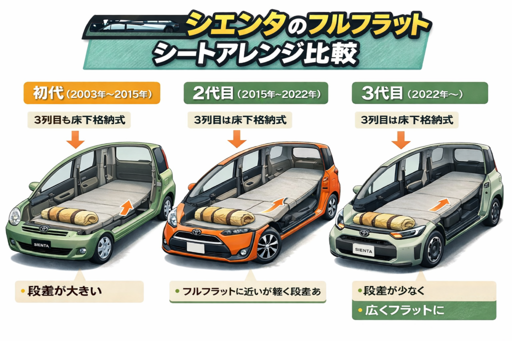 ただし、シエンタは初代・2代目・3代目でシート構造や室内設計が大きく異なります。