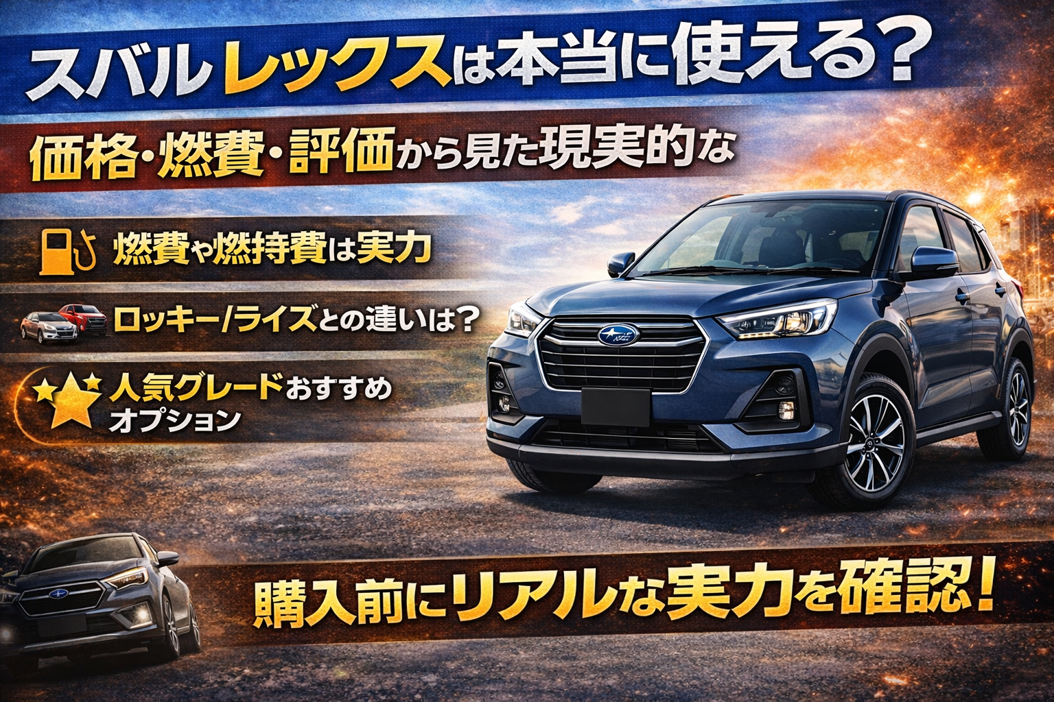 スバル・レックスは、派手さよりも実用性とコストパフォーマンスを重視するユーザーに最適な一台です。通勤・買い物・レジャーを一台で無理なくこなし、維持費も抑えられる点は非常に魅力的です。初めてのSUVとしても安心して選べる、堅実で失敗しにくいモデルといえるでしょう。